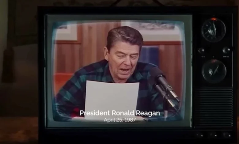 Por Reagan mbajti një fjalim pesëminutësh —në radion kombëtare më 25 prill 1987 që Biblioteka e Reagan e ka publikuar në YouTube — duke kundërshtuar tarifat.